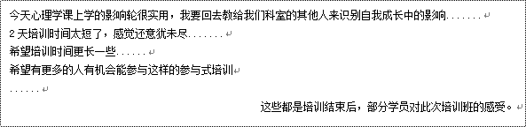 兩天培訓落下帷幕,期間有緊張和尷尬,有快樂和輕松,更多的是意猶未盡。培訓班結束時,學員觀看了培訓會議照片集錦視頻,協(xié)會秘書長田春華對本次培訓做了總結。培訓結束后,學員完成滿意度問卷調(diào)查,在問卷中表示希望在今后有更多機會參與此類心理賦能和綜合管理培訓,并對本次培訓中采用的參與式培訓形式給予了很好的評價。